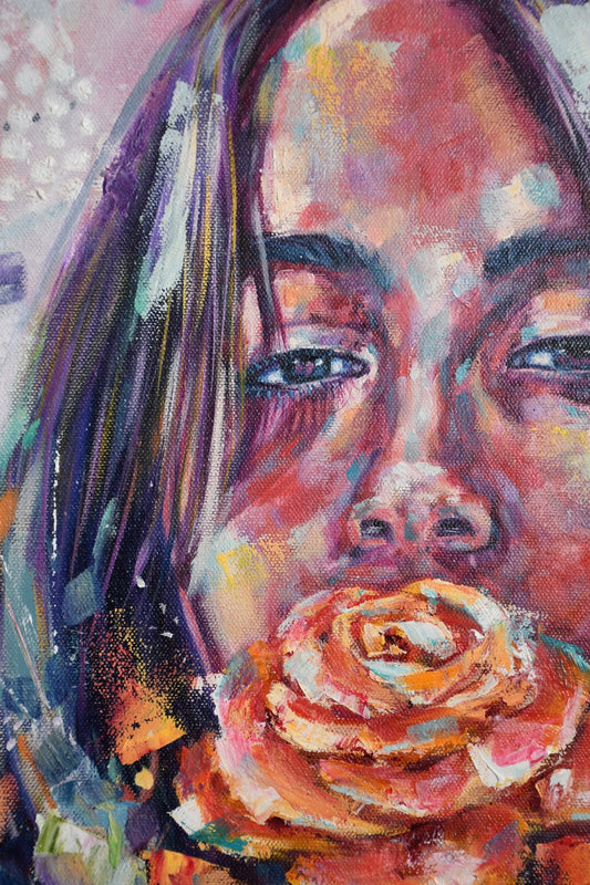 Through my paintings I want to honor the Power that people have, especially Women, to live life, face challenges, fight for what they want, and protect what is important to them. As well as honor the resilience they possess in a romantic, artistic and colorful way.